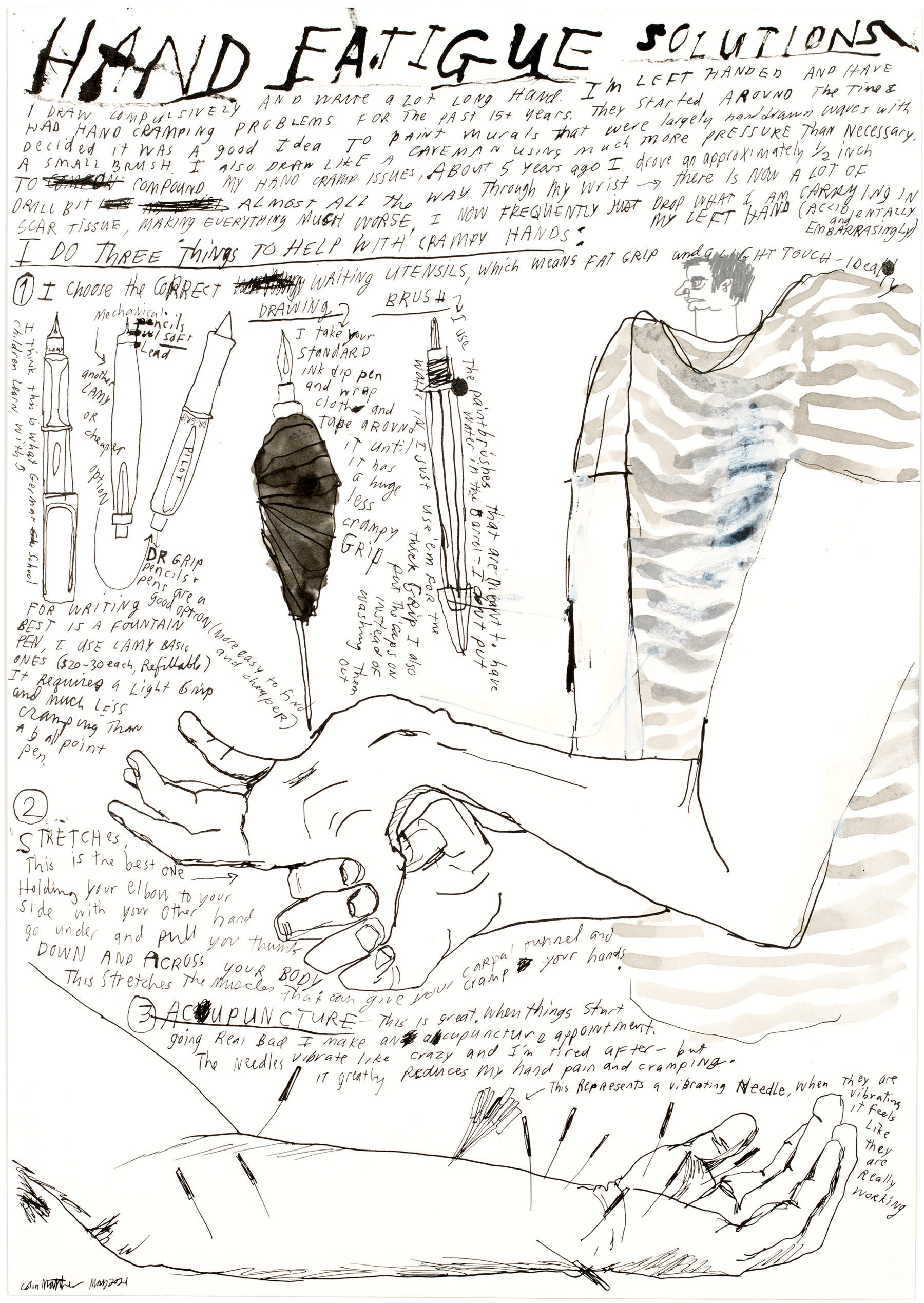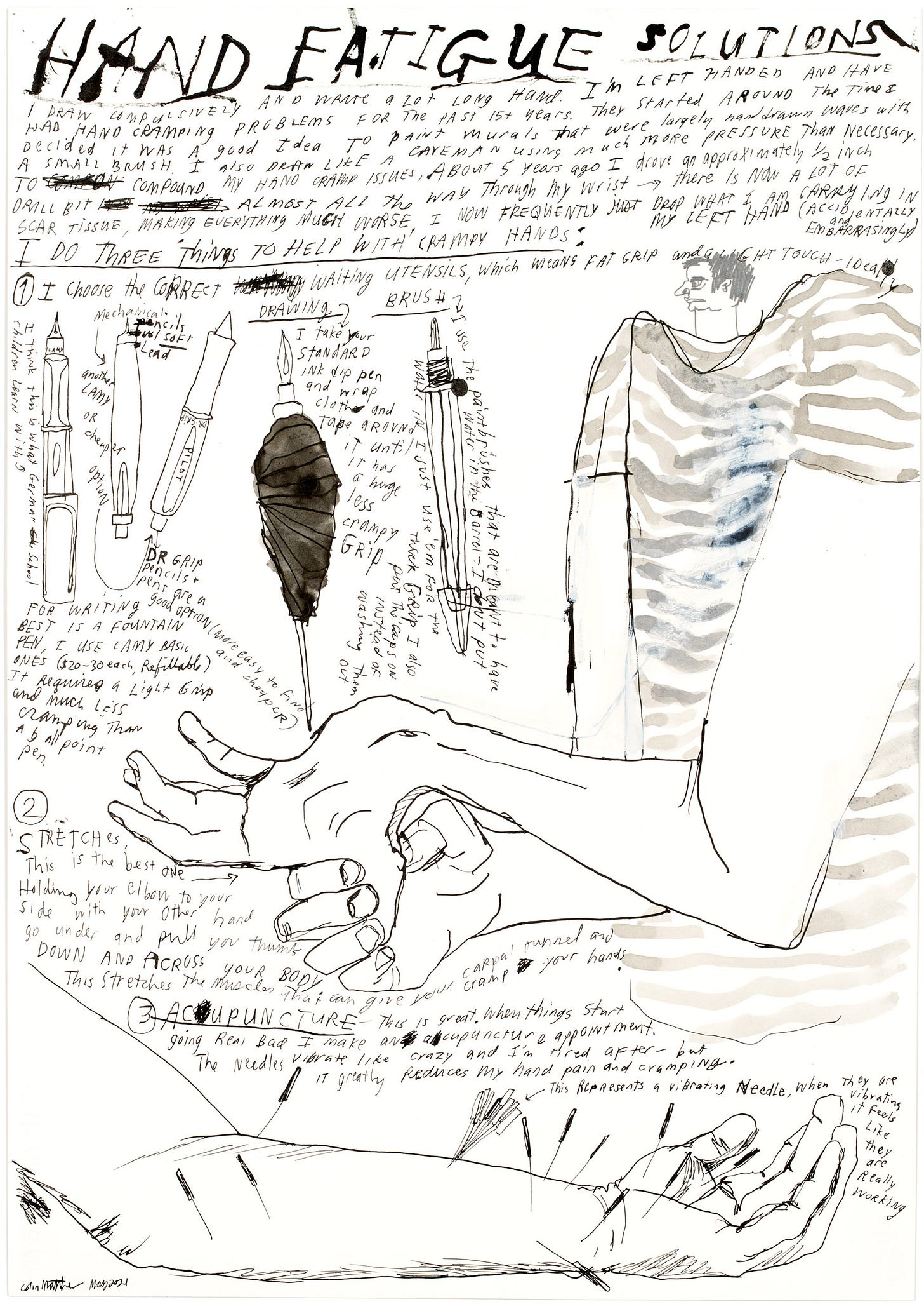 Thin pens and pencils are the enemy. I use Dr Grip pencils, black Blackwings with thick rubber pencil grips, Lamy fountain pens ($20-30, refillable), and for paintbrushes, I prefer the water brushes, becaseu they have a thicker grip, I rarely add water or ink to them. Just use em for the grip.